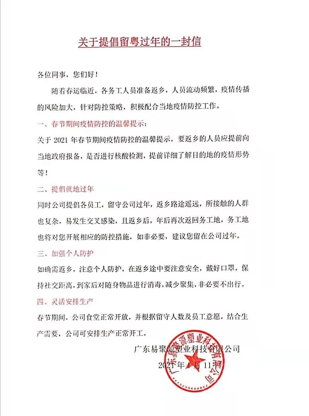 廣東易聚源塑業(yè)經(jīng)內(nèi)部決定,為了響應(yīng)國家,當(dāng)?shù)卣雠_(tái)的號(hào)召,為了大家的身體健康,安全著想,鼓勵(lì)員工留廠過春節(jié),留守人員公司提供包吃包住,額外獎(jiǎng)勵(lì)現(xiàn)金3000元/人。