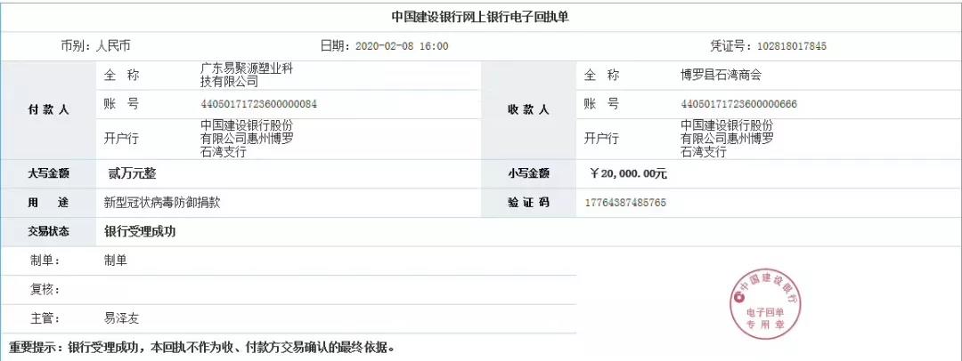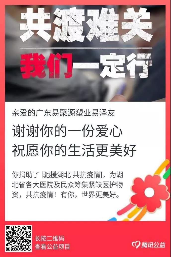 新型冠狀病毒肺炎仍在蔓延,全國各地防控形勢十分嚴峻,牽動億萬人心。1月26號和2月8號,廣東易聚源塑業(yè)科技有限公司的董事長易澤友分別以個人名義和公司名義為新型冠狀病毒防控專項基金自發(fā)捐款2萬元。在物資極度缺乏時,獻上微薄的一份力量,讓這份愛溫暖每一位同胞,向奮斗在一線的醫(yī)護工作者致敬!