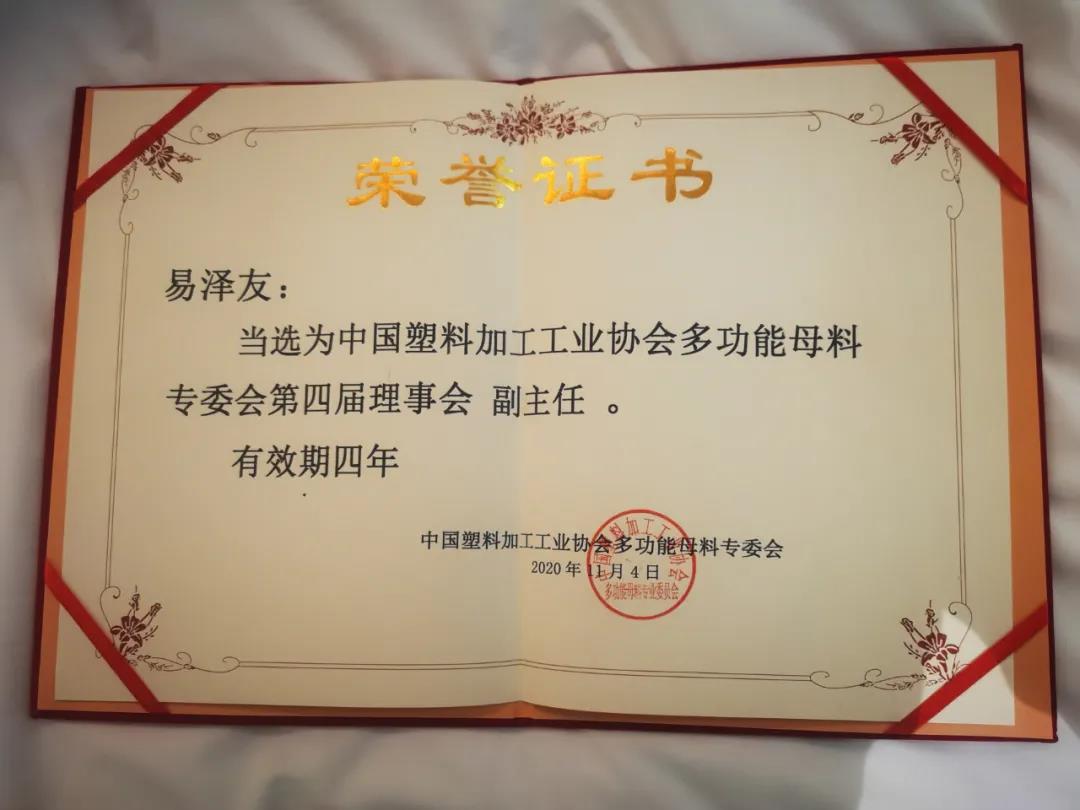 此外,易聚源塑業(yè)董事長易澤友先生當(dāng)選為中國塑料加工工業(yè)協(xié)會(huì)多功能母粒專委會(huì)第四屆理事會(huì)副主任,這充分肯定了易聚源塑業(yè)在塑料加工業(yè)的地位。