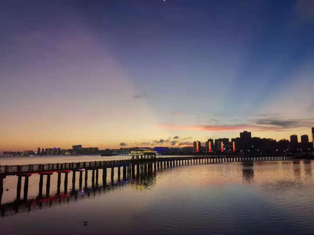 第三站網(wǎng)紅打卡地海上棧道長約2公里,海風(fēng)輕輕吹拂著,一掃夏日的悶熱,感覺十分舒服。木制的棧道向海上延伸,再慢慢回到岸邊。夜晚,沿著棧道邊上的燈都亮了起來,就像一道橫跨在海上的彩虹,景色十分迷人。