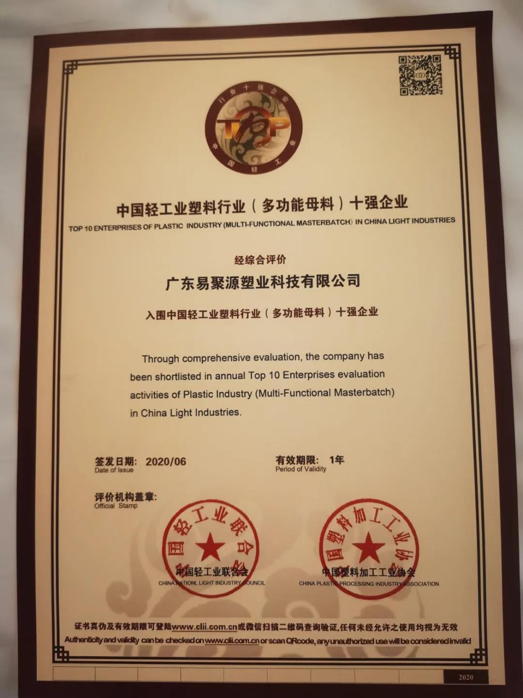 由中國塑料加工工業(yè)協(xié)會(huì)主辦,中國塑協(xié)加工工業(yè)協(xié)會(huì)多功能母料專委會(huì)承辦,于2020年11月3日至5日在江蘇南京國際會(huì)議中心召開2020年中國塑協(xié)多功能母料專委會(huì)2020年會(huì)暨技術(shù)與市場(chǎng)交流會(huì),并頒發(fā)“2019年中國輕工業(yè)塑料多功能母粒行業(yè)十強(qiáng)企業(yè)”,其中廣東易聚源塑業(yè)科技有限公司再次榮獲"中國輕工業(yè)塑料行業(yè)(多功能母粒)十強(qiáng)企業(yè)"的稱號(hào)。
